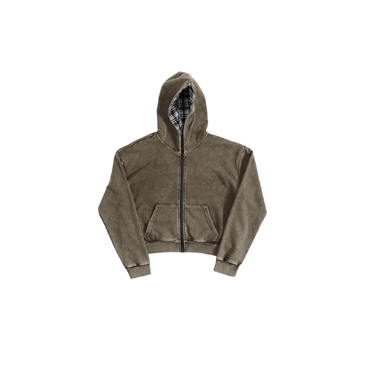Plaid-Lined Washed Zip Hoodie